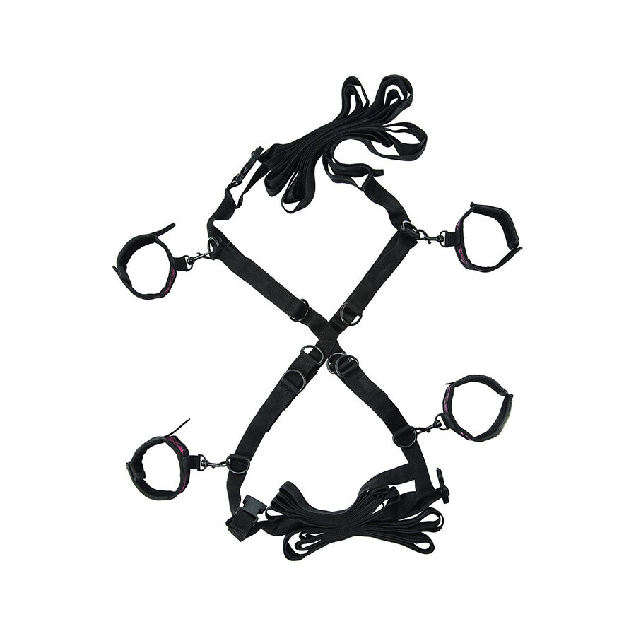 Premeňte svoju posteľ na ihrisko pre zväzovanie s krížovým popruhom Scandal® Over the Bed. Tento systém popruhov je plne nastaviteľný tak, aby sa hodil do akejkoľvek veľkosti postele a je vybavený odolnými popruhmi, otočnými sponami a mäkkými putami na zápästia a členky, ktoré držia vašu partnerku bezpečne roztiahnutú a odhalenú. Či už dráždite, hladkáte alebo dominujete, krížový dizajn zaisťuje neobmedzený prístup ku každej krivke a túžbe.