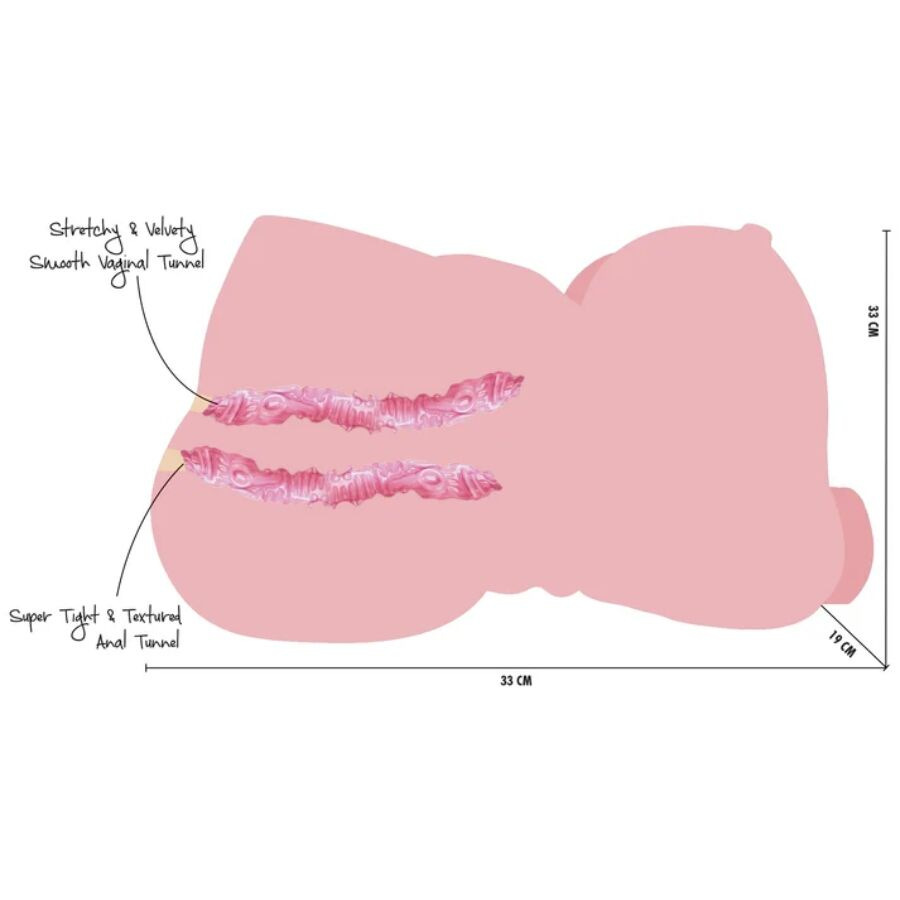 Toto ženské masturbačné torzo vyniká XL fyziognómiou, oslavuje veľkorysé krivky a zmyselnú postavu. Je vybavené dvoma kanálmi rozkoše s rôznymi vnútornými textúrami - kundičkou a zadočkom -, ktoré poskytujú veľmi uspokojivý a pohlcujúci hmatový odpor. Jeho štruktúra umožňuje prirodzené a pevné uchopenie, ideálne pre tých, ktorí majú radi impozantné postavy a hľadajú pohlcujúci zážitok s vysokou úrovňou detailov.